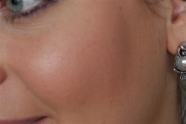 Zo ziet de blush er op mijn wangen uit. Een heel zacht en natuurlijk effect. In close up: