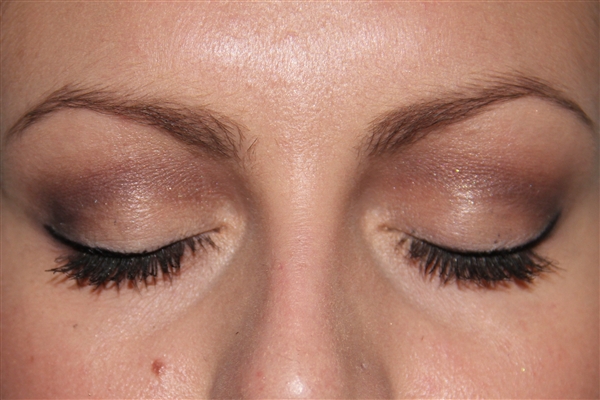 Een rustige, nude ooglook met bruintinten en zachte eyeliner.