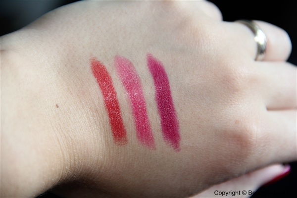 Swatches met flits. V.l.n.r. Sweet Coraline, License To Pink, Matt-erial Girl.