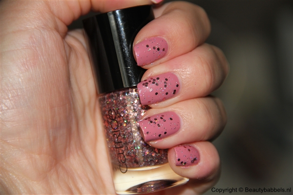 Het tweede lakje is een prachtige (top) coat dat bestaat uit roze glitters in verschillende formaten. Het is echt een mooie oudroze kleur, maar ik kreeg het helaas niet goed op de foto. Ik besloot ‘m over een roze nagellak te dragen, zo krijg je een beetje het idee van de kleur. Op de bovenste 2 foto’s zie je de kleur ook redelijk goed.
