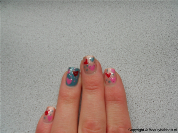 Deze ‘creactie’ was ik vorige maand kwijt, maar deze heb ik gedragen met Valentijnsdag. Ik maak niet vaak een nail-art, maar vond het wel grappig om met Valentijnsdag er eentje te proberen. Het zijn allemaal kleine hartjes en ik heb er een glitter topcoat overheen gedaan.. Maar deze is nog van vorige maand dus.