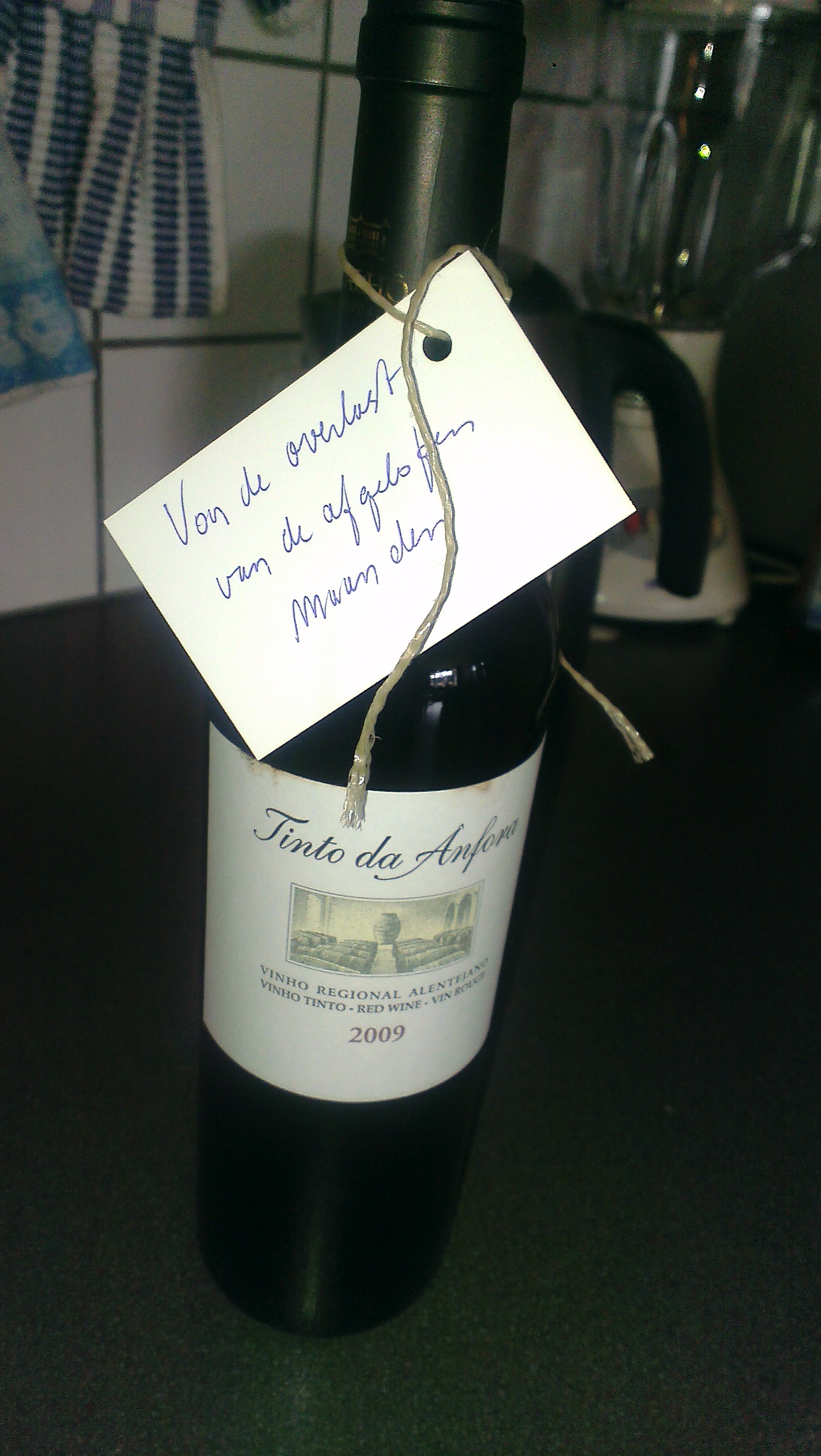 IMAG0693 Dit vond ik ineens voor mijn deur (en ik zag dezelfde fles wijn bij mijn buren staan) met het briefje ‘voor de overlast van de afgelopen maanden’. Van een buurman die flink geklust heeft. Wat netjes :)