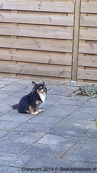 IMAG1518 Wanneer we in de tuin zitten, gaat Lea altijd hier zitten. Zo heeft ze overzicht wat er op de straat gebeurd. Chihuahua’s zijn ontzettend waaks, dat laat Lea hier wel zien. En hoe ze op haar kontje zit, dat vind ik echt zo schattig!