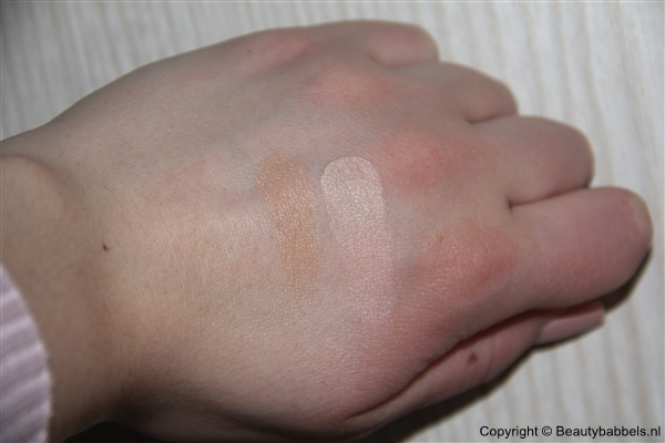 Op mijn hand. De linkerkleur is echt een midden huidskleur en de rechter is licht. Voor mij is dit prima; de lichte kleur voor in de wintermaanden en de donkere kleur zou ik in de zomer kunnen gebruiken.
