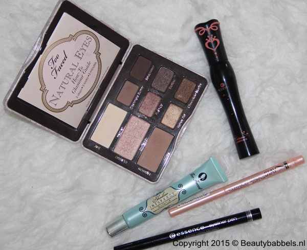 * Too Faced – Natural Eyes Eye Shadow Palette (van de bovenste rij heb ik alle drie de kleurtjes gebruikt, en van de tweede rij heb ik de eerste gebruikt)