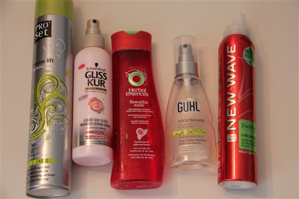 Aan haarproducten heb ik ook het een en ander opgemaakt. Ten eerste een haarlak van Pro Set. Ik vond hem op zich wel fijn, maar heb een andere favoriet. Ook vind ik het leuk om juist met haarproducten te experimenteren. De Glisskur en Guhl haarspray waren allebei een beetje bla.. Ze moesten allebei verzorgend zijn, maar dat merkte ik niet speciaal aan mijn haar. Wel werd mijn haar er vet van, en soms juist stugger! Niet goed voor mijn haar dus.. Herbal Essences shampoo is ook op, de conditioner gebruik ik nog, en deze was prima. Al was ik vroeger, toen ze nog andere verpakkingen gebruikten, anders roken en minder veel verschillende uitvoeringen hadden,  meer fan van ze. De New Wave mousse vond ik erg fijn om te gebruiken, vooral omdat hij tegen de hitte van een krultang mijn haar beschermde. Ik gebruikte deze mousse vooral als ik krullen wilde maken.