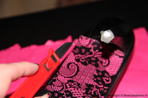 Als laatste werk je de randjes nog even bij. Dit doe je met het mesje dat bijgeleverd wordt. Kijk uit; dit is een erg scherp mesje! Zorg dat je genoeg licht hebt, en heb geduld om dit langzaam te doen.